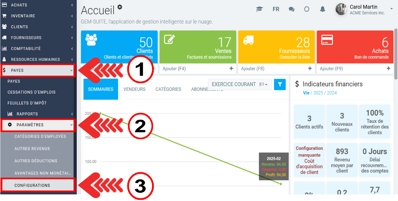 Dans la configuration des paiements, allez dans le menu Payes > Paramètres > Configurations.