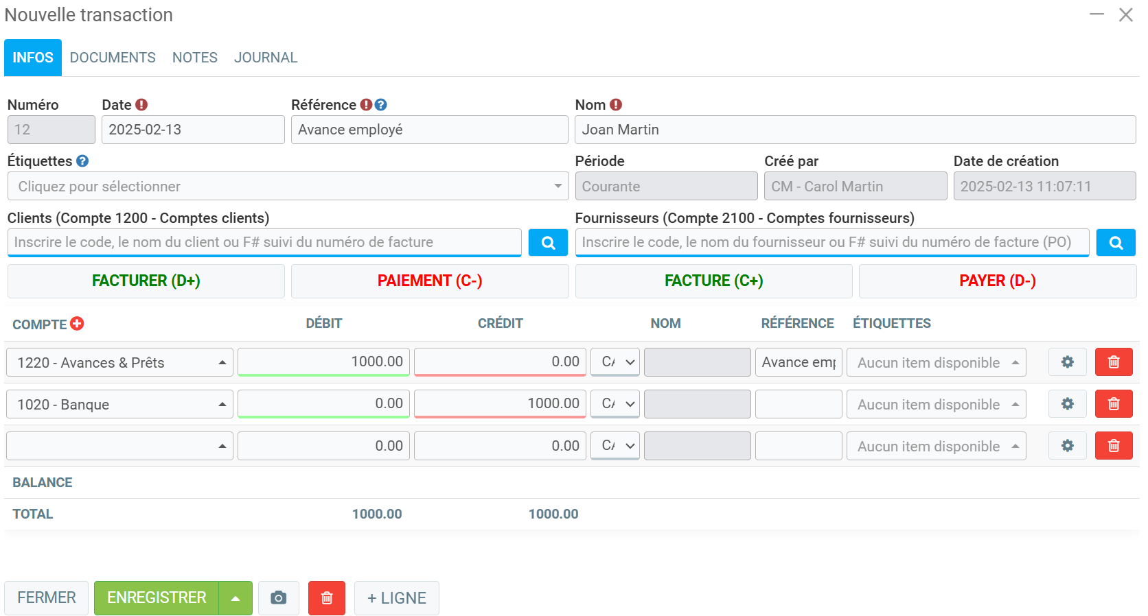 - Dans la référence, mettez l’employé, le numéro de paie (optionnel),
