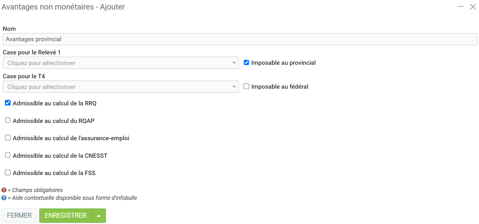 Si vous désirez ajouter des avantages non monétaires, par exemple, la location d'une voiture, c'est ceci que vous pouvez configurer ceux-ci. Les avantages non monétaires font en sorte que la ressource humaine est imposé sur la valeur de l'avantage.
