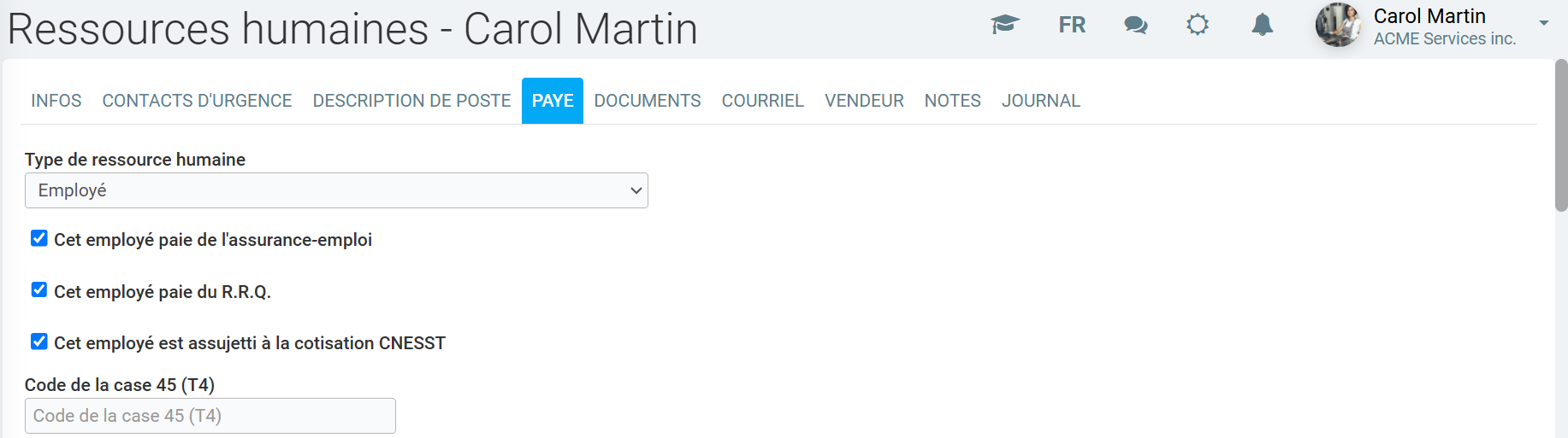 Cet employé paie de l’assurance chômage: Bien cocher cette case si votre employé doit payer de l’assurance chômage. Si la loi prévoit qu’un employé n'a pas à en payer, par exemple, s'il détient un certain pourcentage des parts de la compagnie, ne pas cocher cette case.