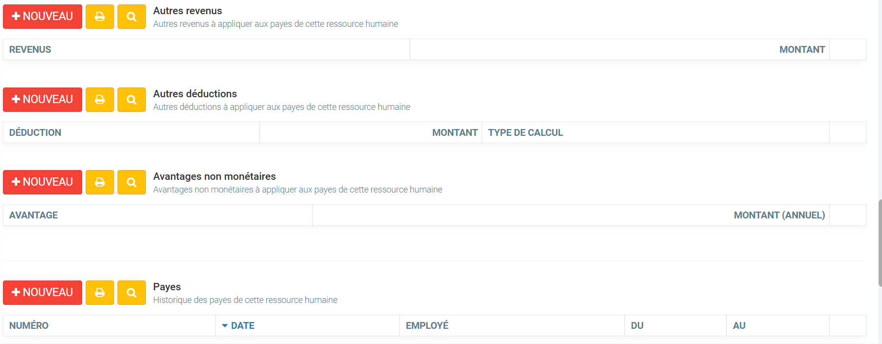 Cela est particulièrement pratique lorsque vous avez plusieurs employés avec les mêmes revenus/déductions à configurer, cela permet de le configurer une fois ici, et ne pas avoir à faire l'étape suivante dans chaque fiche des ressources humaines.
