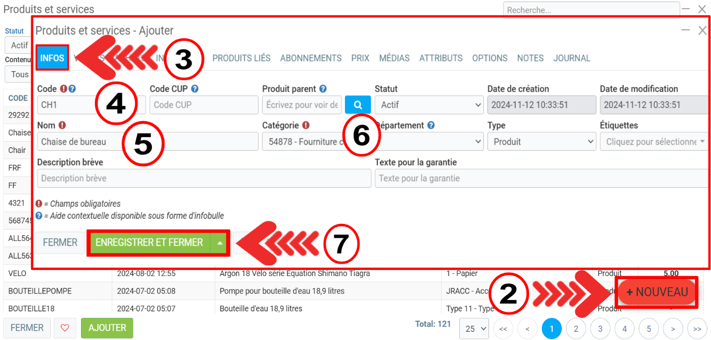 Dans la liste des Produits et Services, cliquez sur +Nouveau.