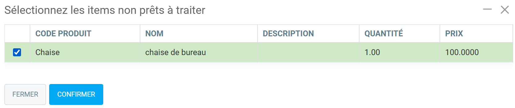 Si vous cliquez sur le bouton Subdiviser, une fenêtre s'ouvre pour indiquer le(s) produit(s) qui n'est (ne sont) pas prêt(s) à être traité(s).