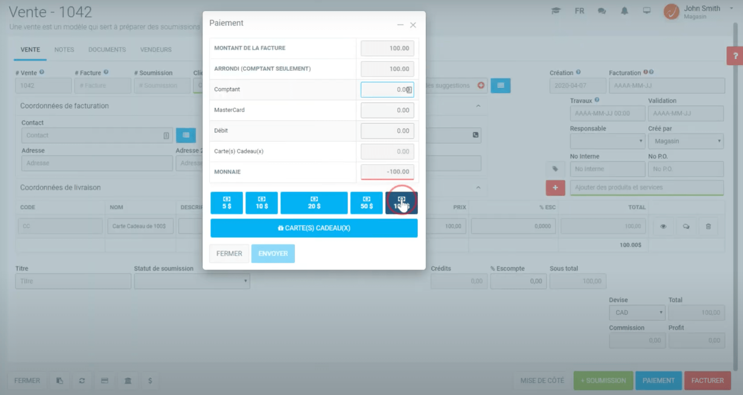 Au bas de la boîte Paiement, sélectionnez le montant de la carte cadeau. Ce montant sera entré automatiquement dans la case Comptant. Cliquez ensuite sur Envoyer.