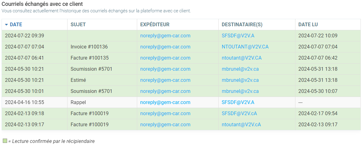 Ensuite, les courriels ayant transités par nos serveurs seront affichés dans les fiches de vos clients.