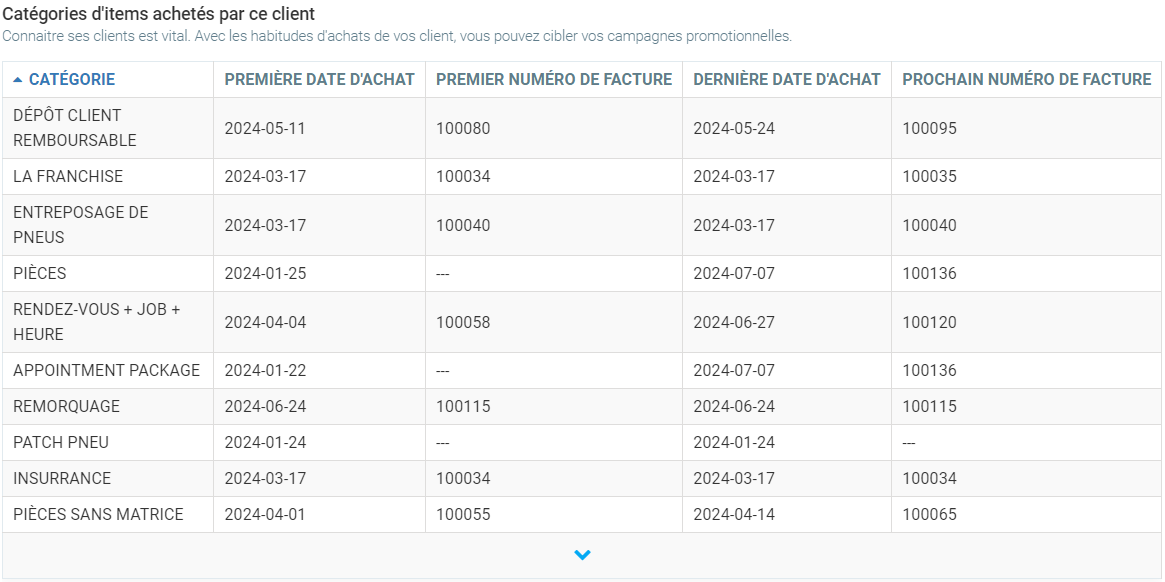 Dans cet onglet, vous pouvez voir les Suivis associés à ce client, Courriels échangés avec ce client et Catégories d'items achetés par ce client.
