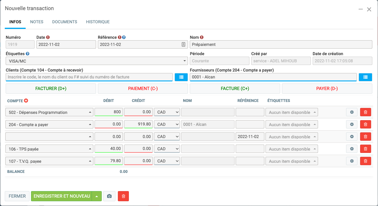 Commençons par une nouvelle transaction sur laquelle vous allez inscrire la date de la transaction dans la référence. Donnez-lui ensuite le nom "Prépaiement", sélectionnez le fournisseur et cliquez sur le bouton FACTURE (C+). Entrez les montants et cliquez sur le bouton vert Enregistrer et nouveau.