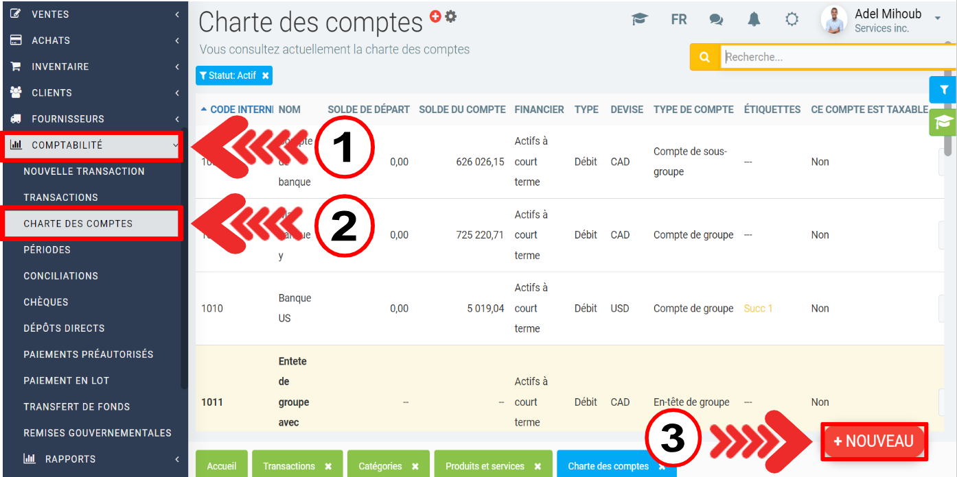 Cliquez sur Comptabilité > Charte des comptes > +Nouveau.
