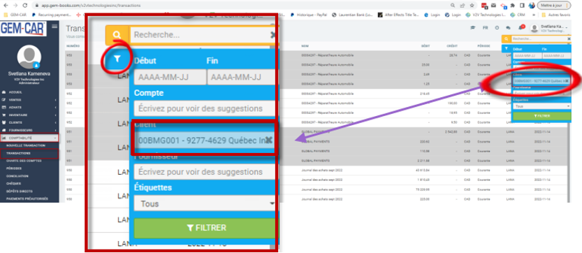 Par le module des transactions au grand livre, faites une recherche en entrant le nom du client et en cliquant sur l’icône du filtre.