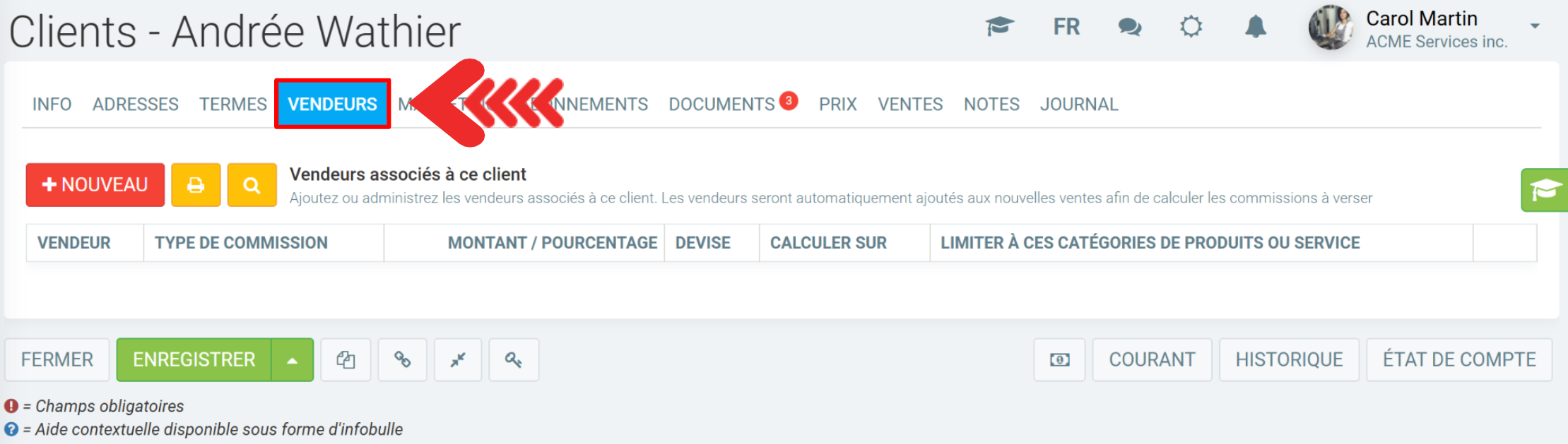 Dans la fiche d'un client, vous y trouverez l'onglet Vendeurs. Dans cet onglet, vous pouvez configurer ou modifier les commissions pour le client concerné (plus d'informations sur la configuration plus bas).
