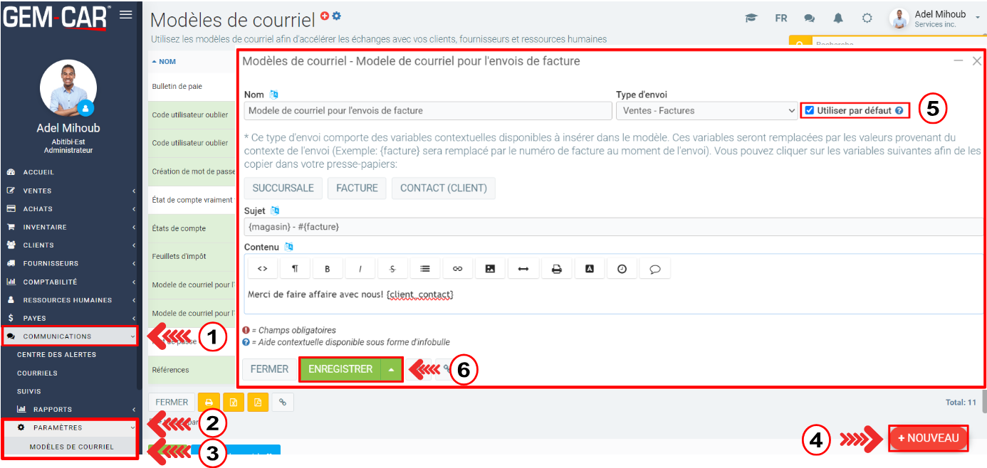 Cliquez sur Communications > Paramètres > Modèles de courriel.