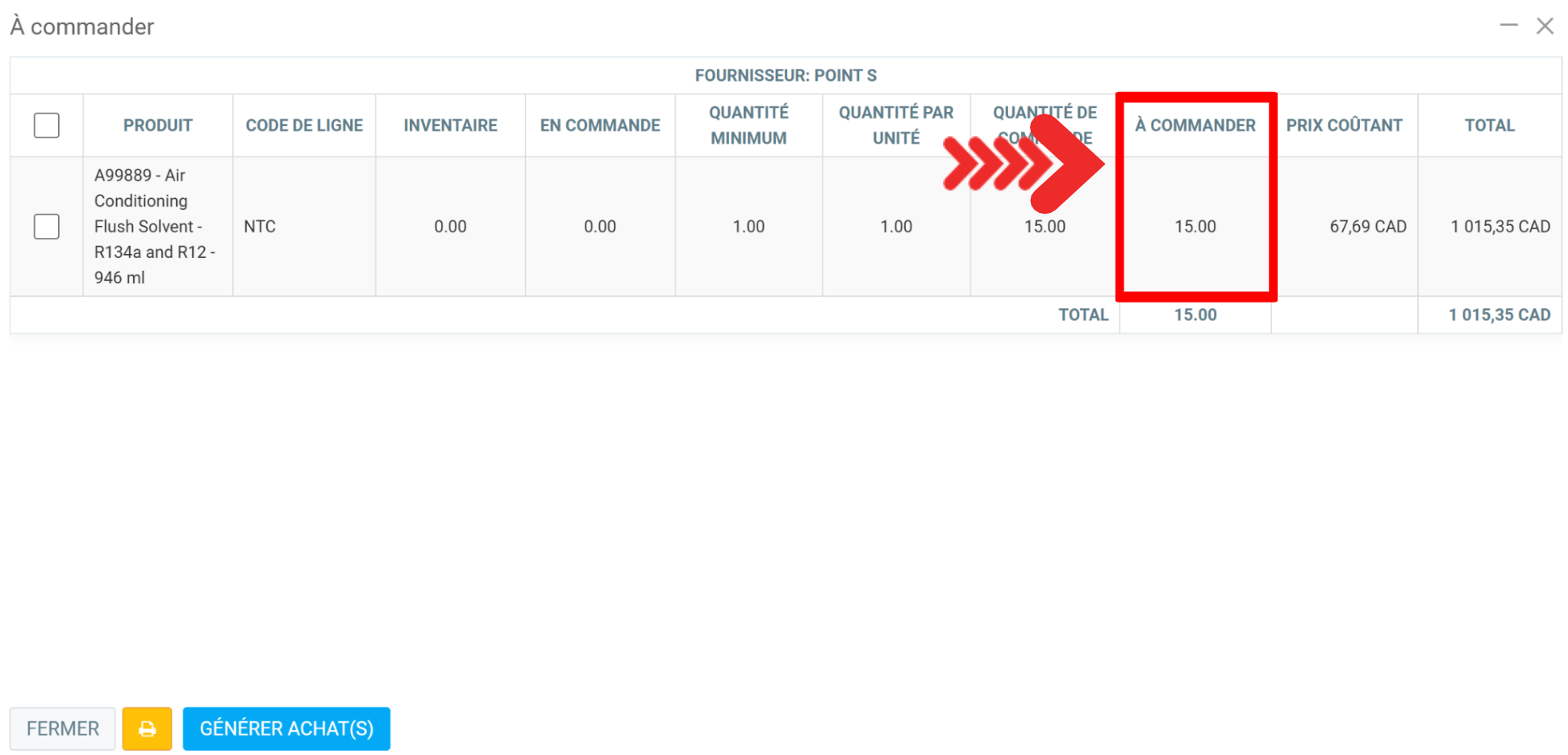 Dans la fenêtre À commander, vous verrez la colonne À commander avec la quantité par défaut.