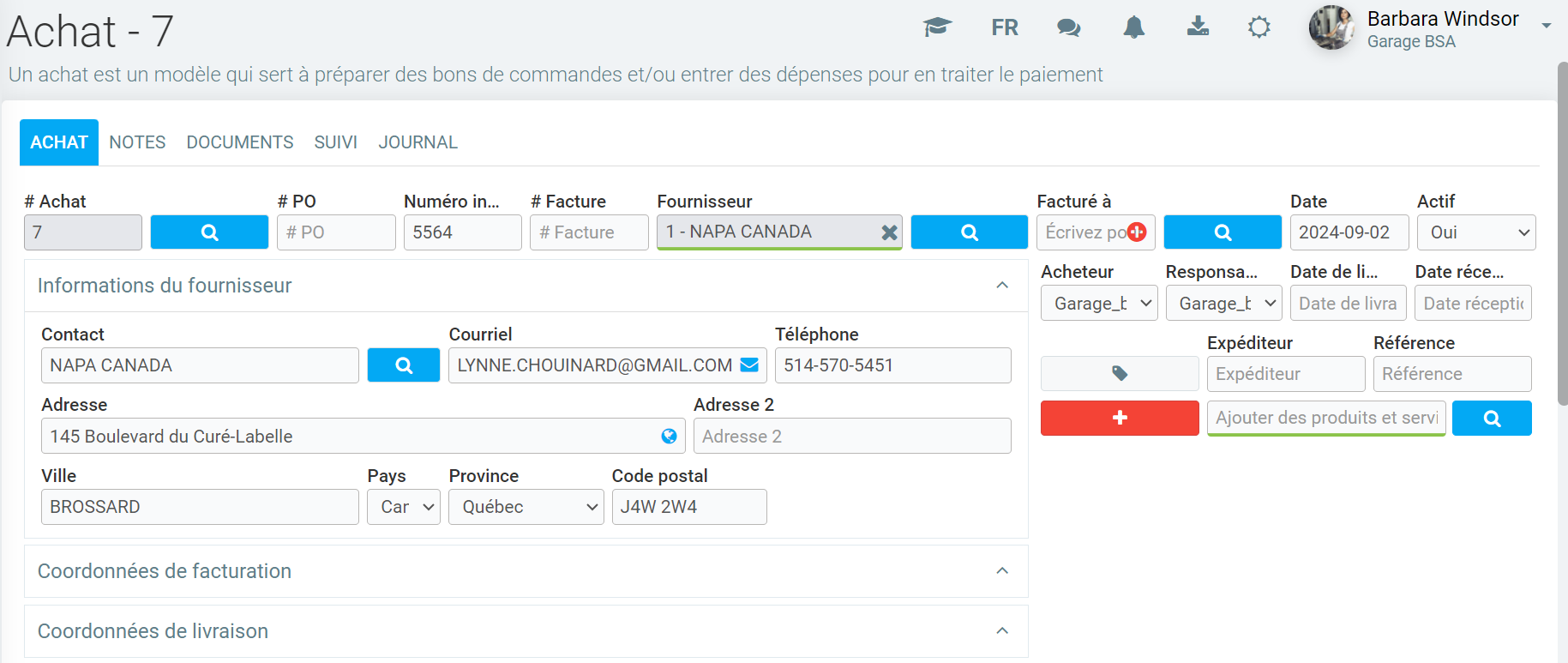 Pour attribuer une escompte à un achat, cliquez sur Achats > Achats > +Nouveau.