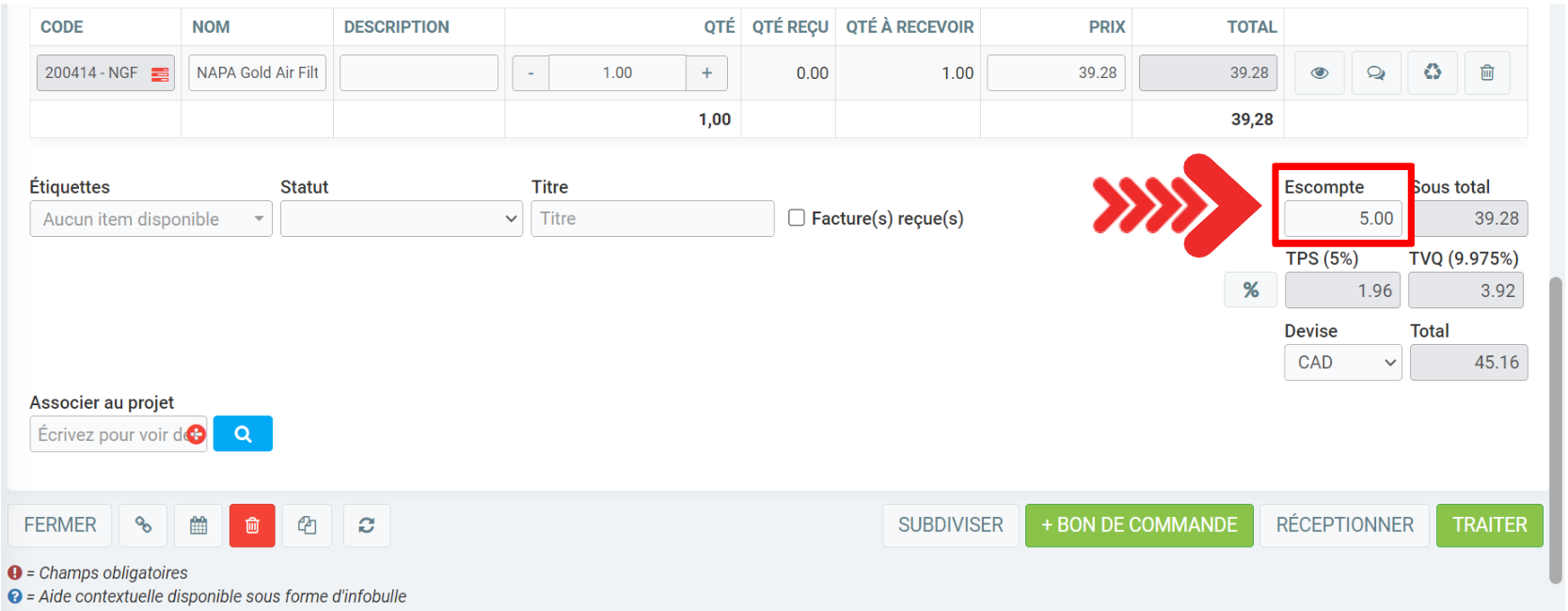 Remplissez le formulaire d'achat et, à la fin, à côté du Sous total, ajoutez un Escompte.