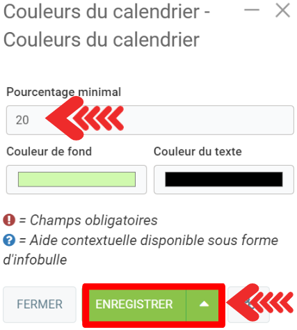 Cette fonctionnalité vous aident à afficher une couleur pour les jours du calendrier de l'agenda selon le pourcentage d'utilisation de la plage horaire disponible.