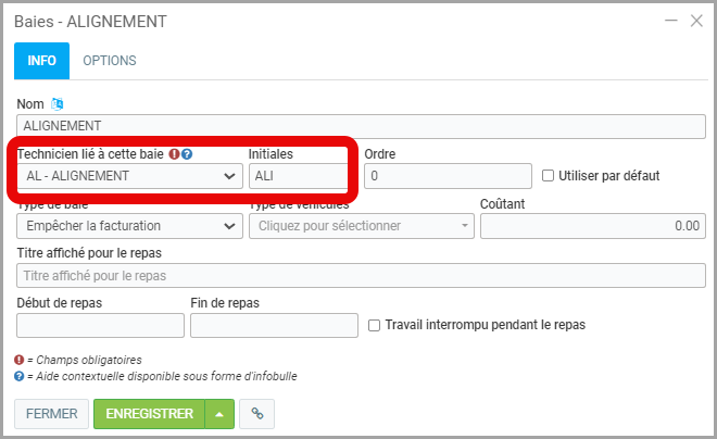 - Sous l'onglet Info, sélectionnez le Technicien lié à cette baie. Il s'agit ici de sélectionner une ressource telle que créée à l'étape 2 ci-haut. Il pourrait s'agir du poste de travail d’Alignement par exemple.
