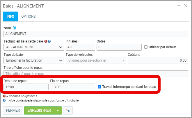 Notez que si rien n'est mis dans Titre affiché pour le repas, Diner apparaîtra par défaut. - Sous l'onglet Options, si la Baie concerne une ressource humaine en particulier, il peut être important de sélectionner Le technicien assigné à cette baie peut s'assigner des travaux non assignés pour lui permettre de poinçonner sur le travail d'un autre mécanicien.