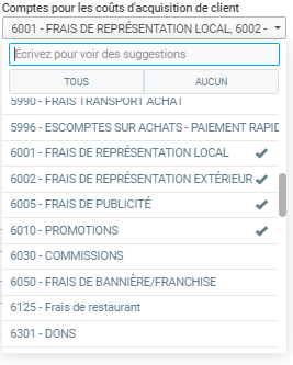 Note: pour les comptes pour les coûts d’acquisition de clients, vous pouvez sélectionner plusieurs GL. Les frais de ventes sont généralement dans les 6000.