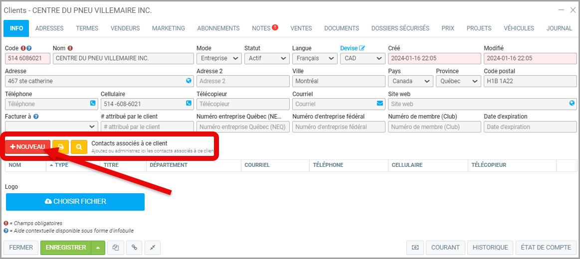Si c'est le cas, il sera possible d'ajouter des Contacts associés à ce client en cliquant sur +Nouveau.