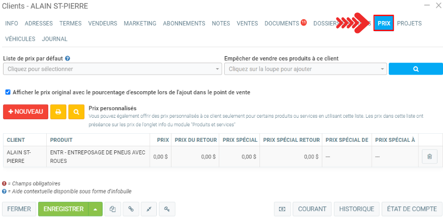 Dans l'onglet Prix, vous avez la possibilité d'insérer des Listes de prix.