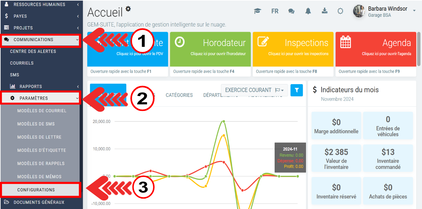 Pour configurer votre Outlook afin d'envoyer des emails aux clients, dans le menu de gauche, cliquez sur Communications > Paramètres > Configurations.
