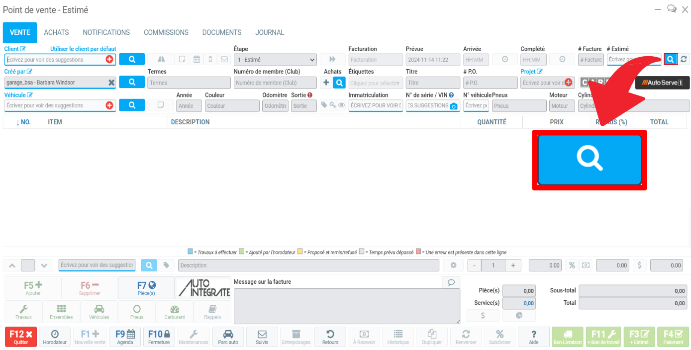 Sur le Point de vente, cliquez sur l'outil de recherche dans la loupe bleue à côté de Estimé pour rechercher une facture que vous souhaitez envoyer au client.