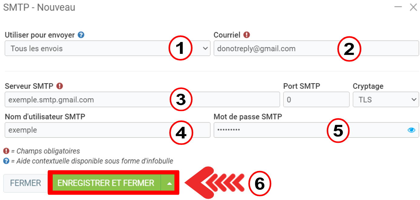 Une fenêtre s'affichera à l'écran, dans laquelle vous pourrez remplir les champs. Pour l'email, tapez votre email SMTP, pour le serveur, tapez simplement le code du serveur. En ce qui concerne le cryptage, TLS et SSL sont des protocoles de cryptage qui sécurisent les communications SMTP. TLS est l'option la plus récente et la plus sûre, tandis que SSL est considéré comme dépassé en raison de vulnérabilités connues dans ses versions antérieures. Pour une transmission sécurisée du courrier électronique, il est recommandé d'utiliser SMTP over TLS (STARTTLS) plutôt que SMTP over SSL. Le port par défaut pour le SMTP est normalement le port 25. Tapez simplement vos identifiants SMPT sous nom d'utilisateur et mot de passe.