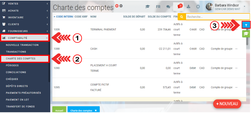 Pour activer un compte inactif, cliquez sur Comptabilité > Charte des comptes.
