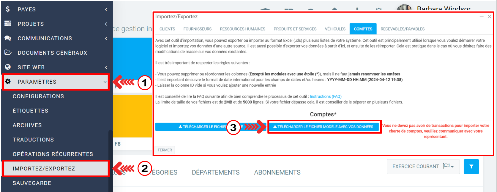 Une fenêtre apparaîtra. Cliquez sur l'onglet Comptes et ensuite sur le bouton bleu Télécharger le fichier modèle avec vos données.