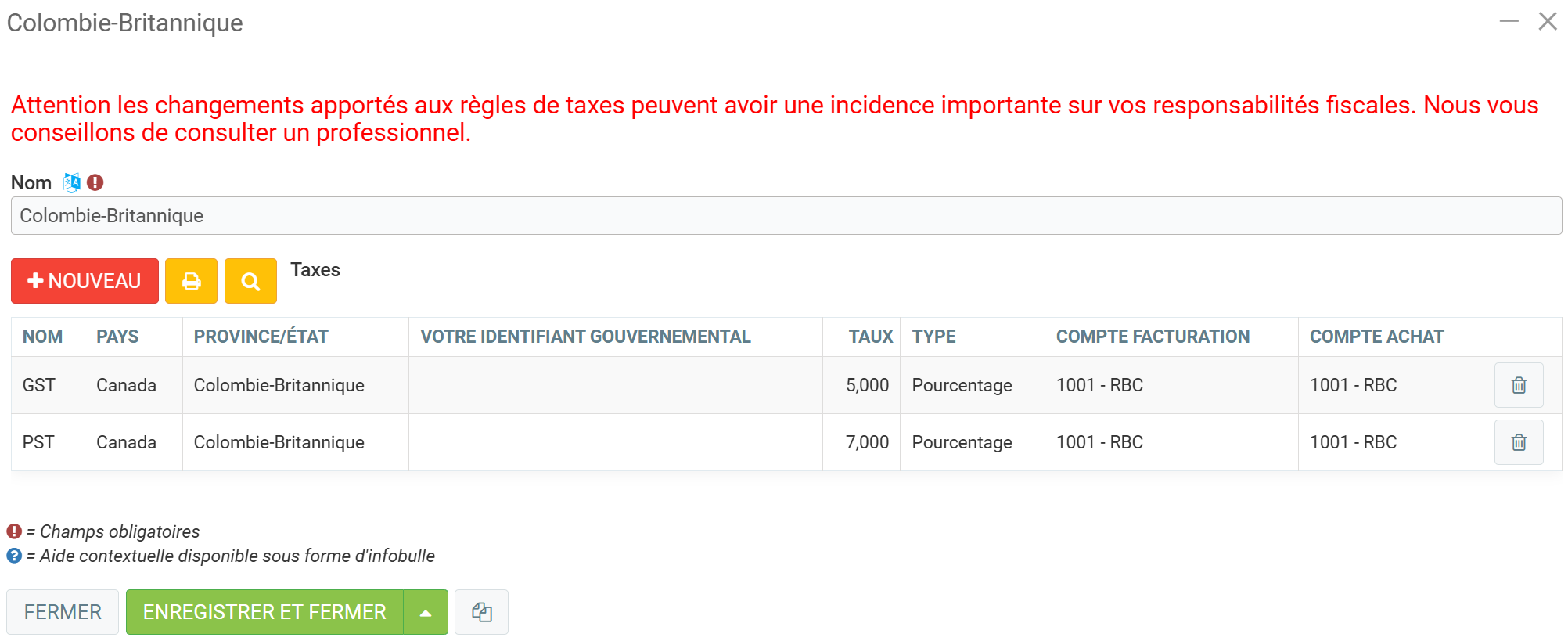 Vous pouvez saisir une nouvelle taxe et y inclure les taxes en vigueur dans la province concernée. Dans le cas de la Colombie-Britannique, il s'agit de la TPS et de la TVP.