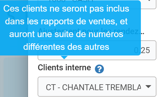 Si vous n'êtes pas sûr de ce qu'est un client interne, survolez le nom "client interne" et le message suivant apparaîtra: "Ces clients ne seront pas inclus dans les rapports de vente, et auront une suite de numéros différentes des autres".