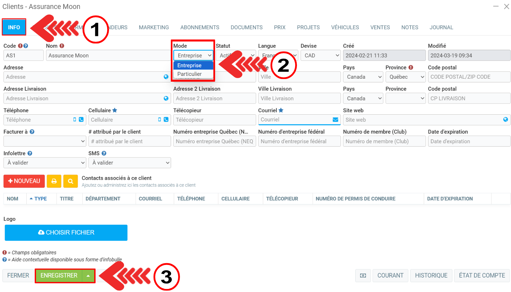 Dans l'onglet Info, inscrivez toutes les informations et dans le mode, sélectionnez entreprise.