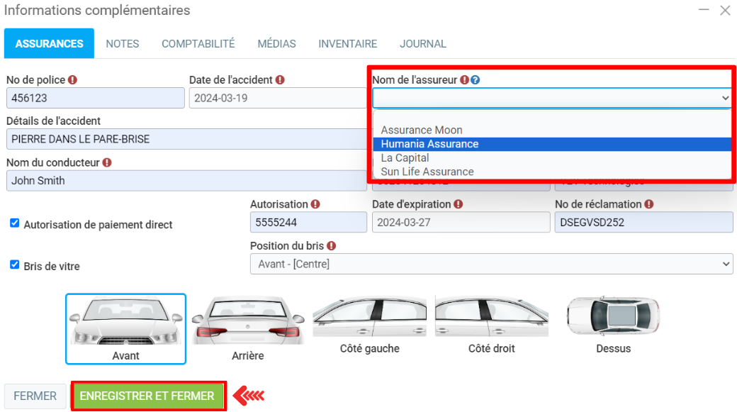 Dans l'option Nom de l'assureur, les compagnies d'assurance seront listées (si elles ont été préalablement listées en tant que clients).