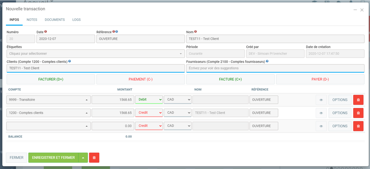Pour ce faire, il suffit de créer une nouvelle transaction de type facture pour le client concerné et au lieu d'utiliser un compte de revenus (ou de dépenses dans le cas d'un fournisseur), choisissez le compte d'ajustements qui par défaut est le compte 9999.