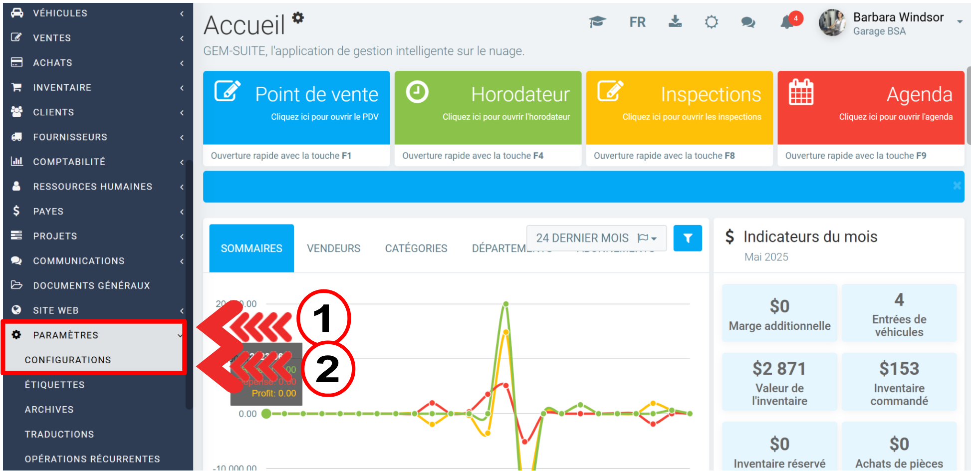 La première fois que vous utiliserez GEM-CAR, le système vous aidera à configurer vos taxes selon votre province. Il n'est plus nécessaire de modifier les configurations de taxes après cette étape. Lorsque vous générez une soumission à partir d'une vente, vous devriez voir vos numéros de taxes à côté du total en bas. Par contre, si vous avez fait une erreur et que vous souhaitez modifier vos configurations, voici la procédure.