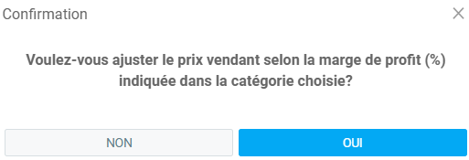 Une boîte de dialogue s'ouvre avec le message suivant: "Voulez-vous ajuster le prix vendant selon la marge de profit (%) indiquée dans la catégorie choisie?"
