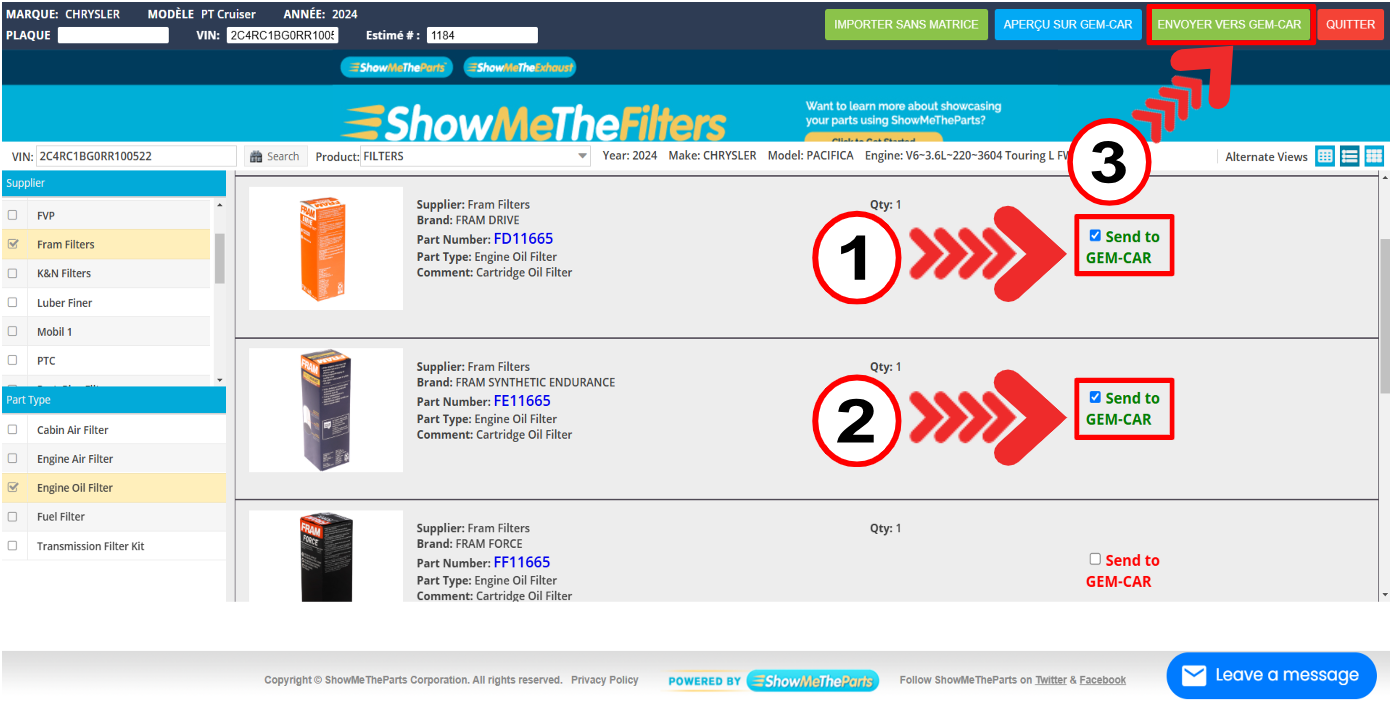 Dans l'onglet Fram Filters, cochez les cases des produits que vous souhaitez Send to GEM-CAR.