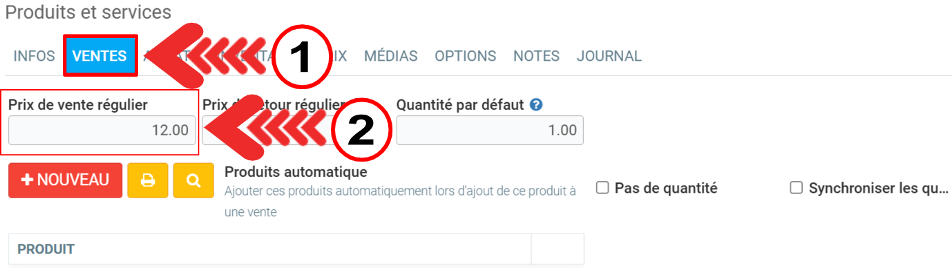 Dans l'onglet Ventes, modifiez le Prix de vente régulier.