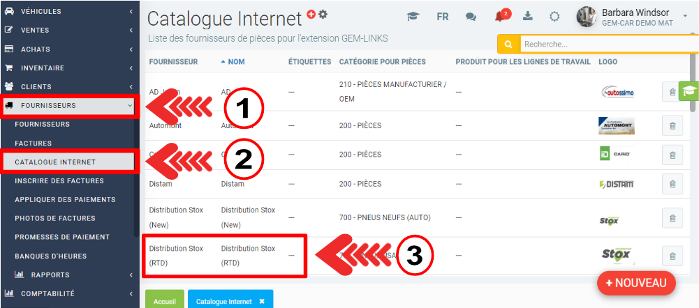 Dans votre GEM-CAR, cliquez sur Fournisseurs > Catalogue internet.