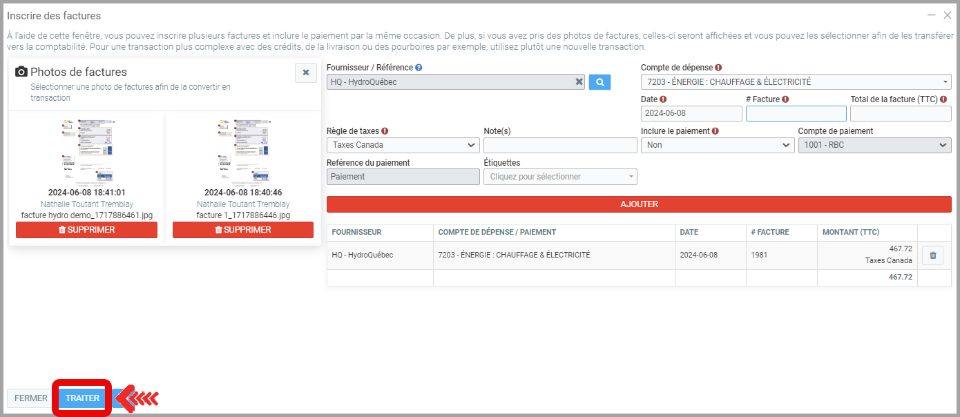 Lorsque vous avez complété la saisie de vos factures, cliquez sur Traiter.