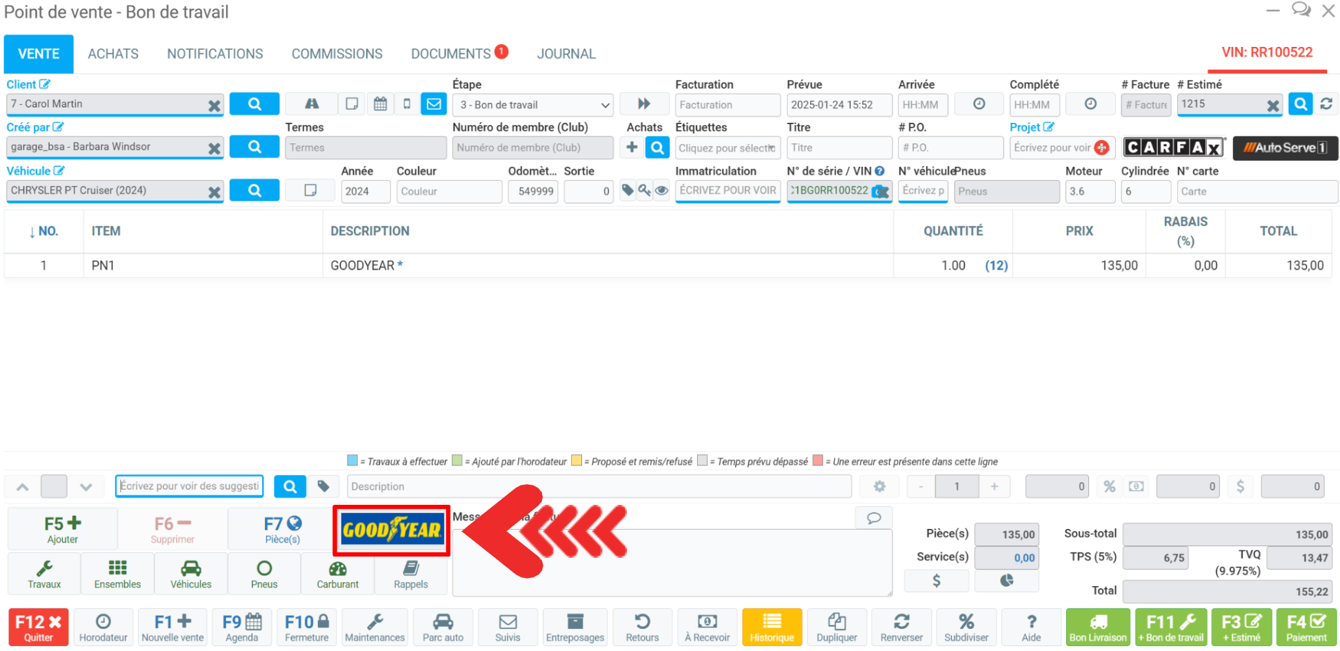 Avant de compléter ou de facturer la transaction avec votre client, cliquez sur l'icône Goodyear.