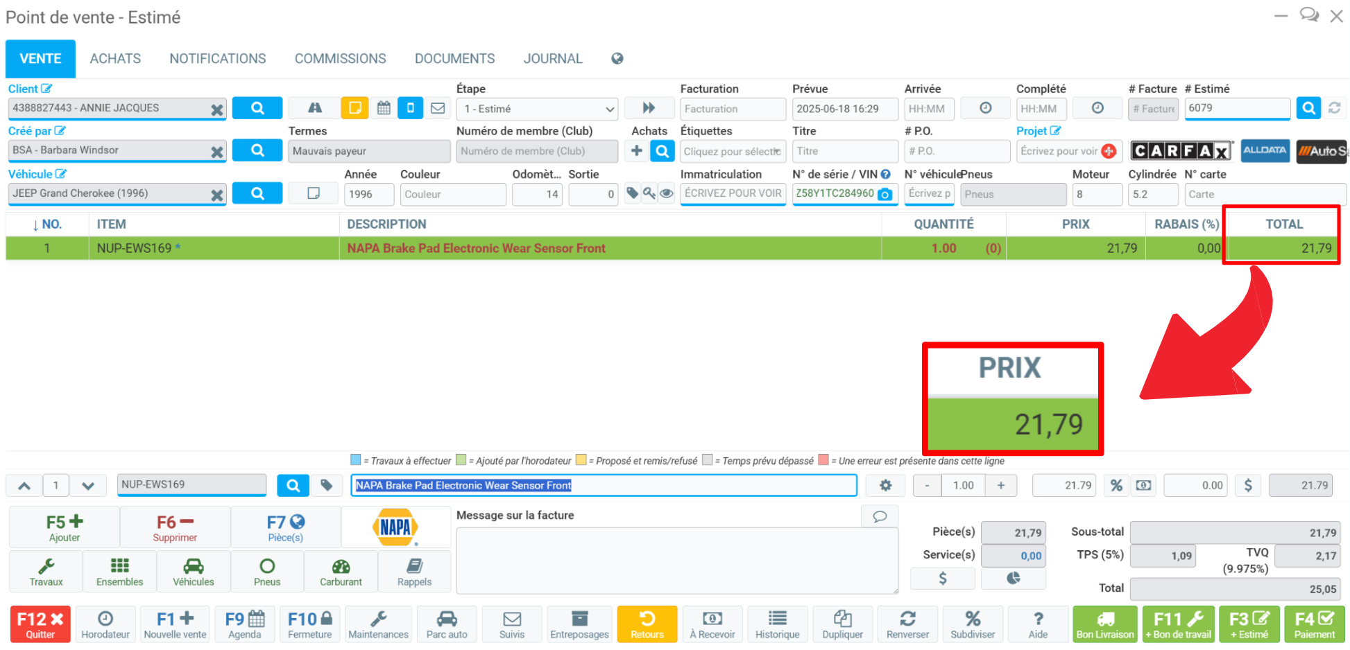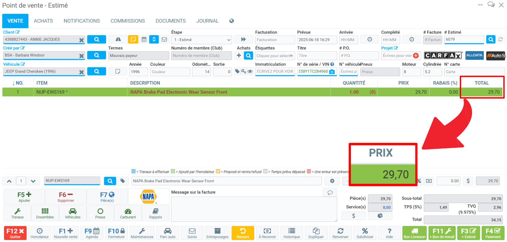 Pour commander une pièce dans une vente, commencez par ouvrir votre Point de vente, sélectionnez le client, les produits et les services, puis cliquez sur le bouton F7 Pièces ou sur le fournisseur par défaut situé à côté de ce bouton.