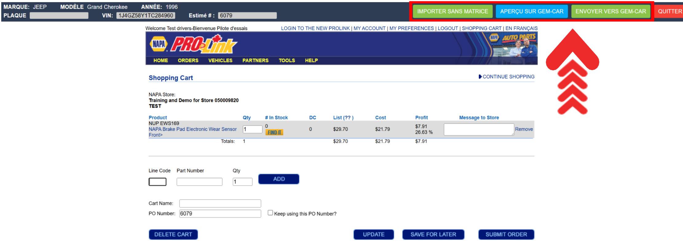 Après avoir sélectionné les produits et les avoir ajoutés à votre panier, si vous appuyez sur le bouton vert Envoyer vers GEM-CAR, dans le coin supérieur droit de l'écran, les produits seront envoyés au Point de vente au prix coûtant indiqué sur le site web du fournisseur.