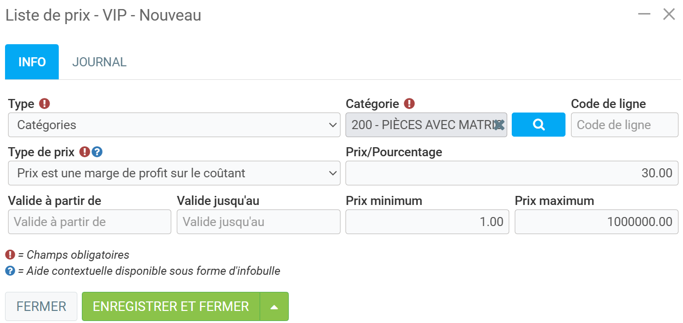 Note: choisissez l'un des trois paramètres de marge de profit (changement de catégorie, changement de fournisseur ou création d'une liste de prix) pour déterminer la marge de profit et laissez les autres à zéro. Dans le cas contraire, l'un des paramètres aura la priorité sur l'autre et la valeur du produit sera incorrecte.