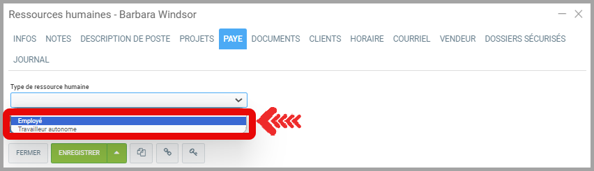 Pour une ressource humaine qui travaille pour vous à titre d'Employé, le paiement de ses services figurera sur votre liste de paie (payroll) et sa fiche complète devra être remplie avec toutes les données nécessaires par le personnel de votre service de paie.