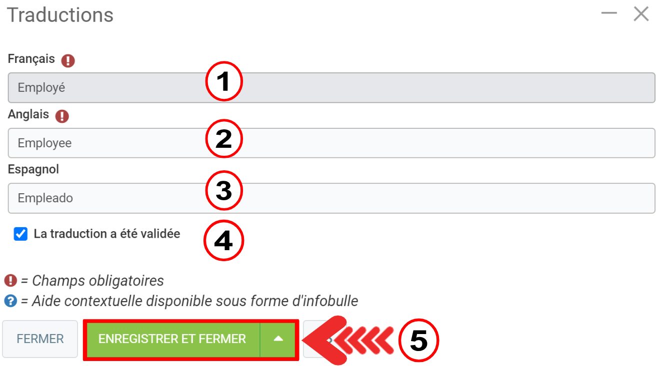 Inscrivez la traduction sous Anglais et Espagnol, sélectionnez l'option La traduction a été validée.
