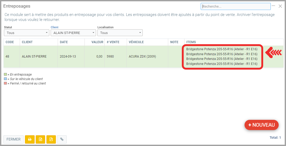 Vous y trouverez les pneus entreposés pour le client et le véhicule sélectionnés au Point de vente.