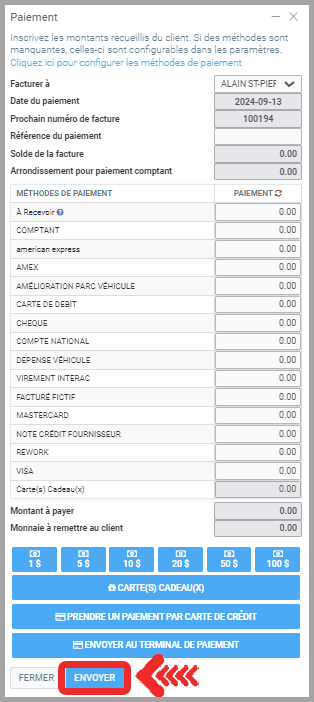 Procédez au Paiement même si le solde est à 0$ pour sortir les pneus de l'entreposage dans le système.