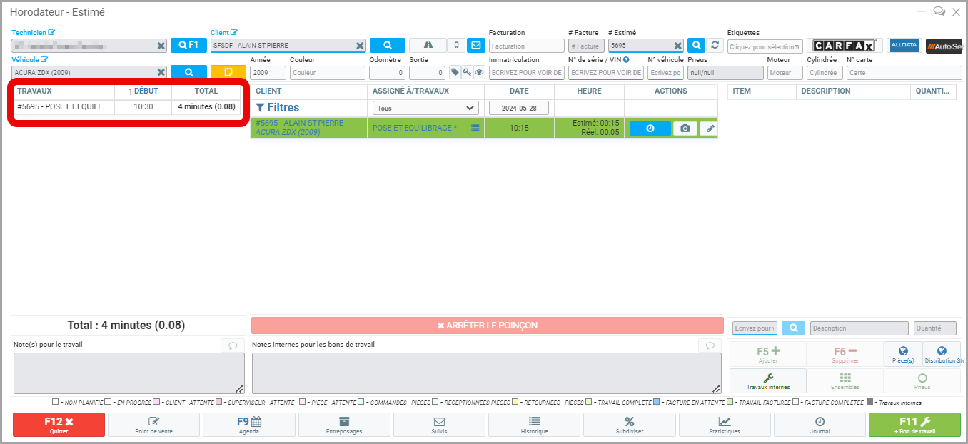 Estimé avec contrôle du temps: temps réel du technicien et le coûtant de la baie