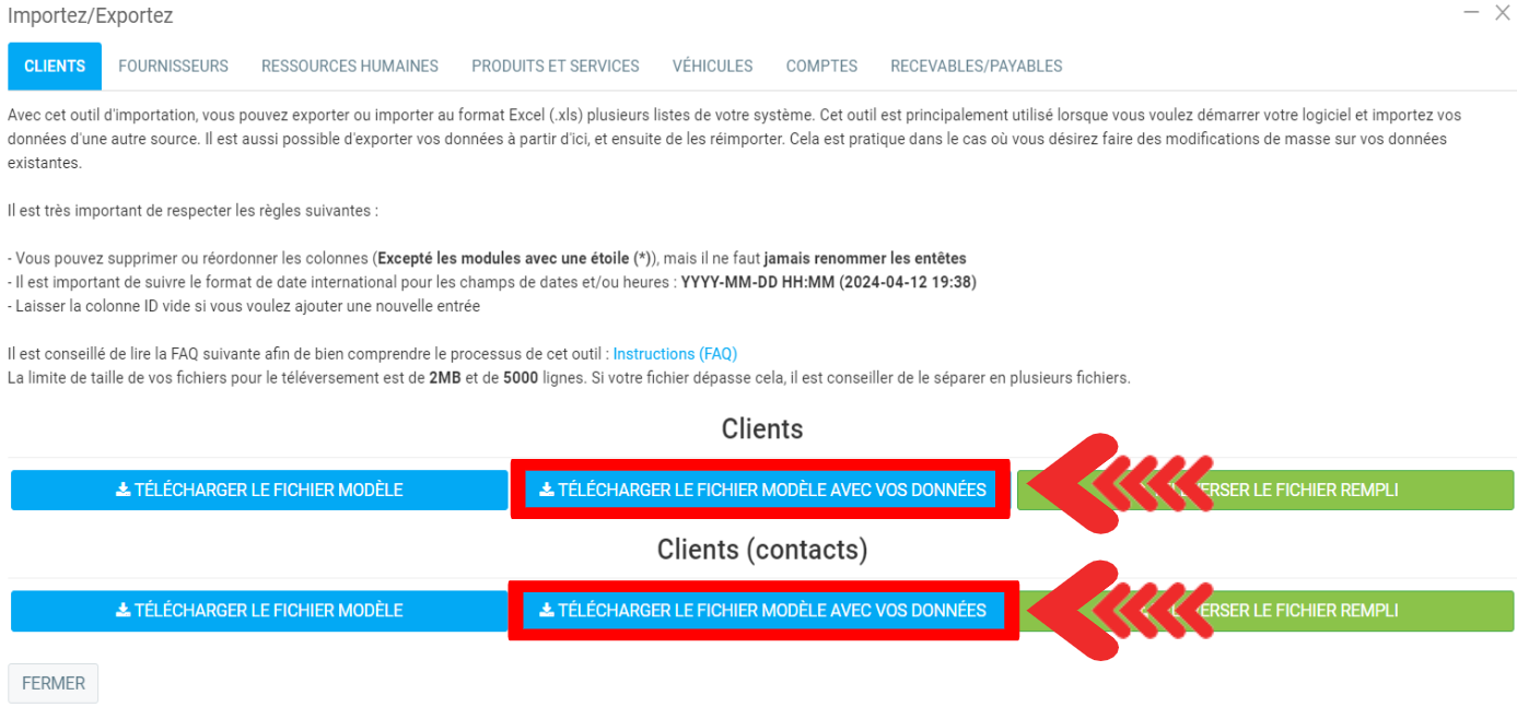 Exportation de données - clients, fournisseurs, ressources humaines, véhicules